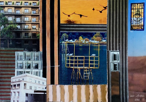 Εικονογράφηση: Σοφία Ανδρέου, κολάζ σε χαρτόνι: Πετώντας έξω από το τετράγωνο